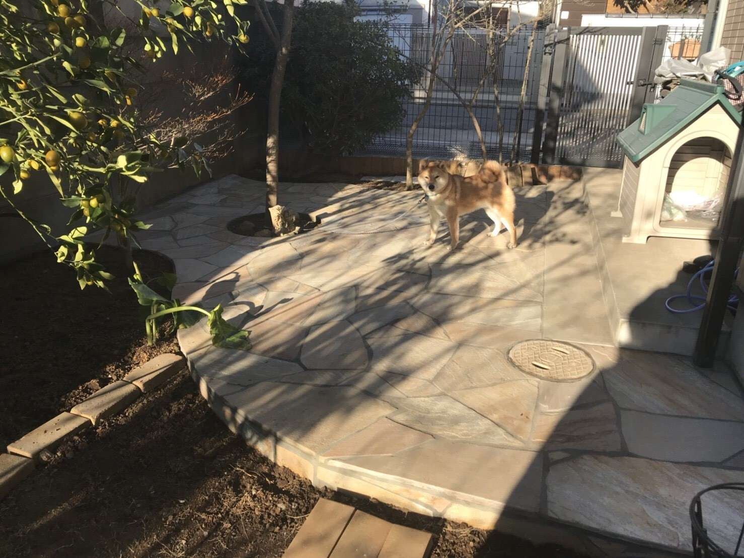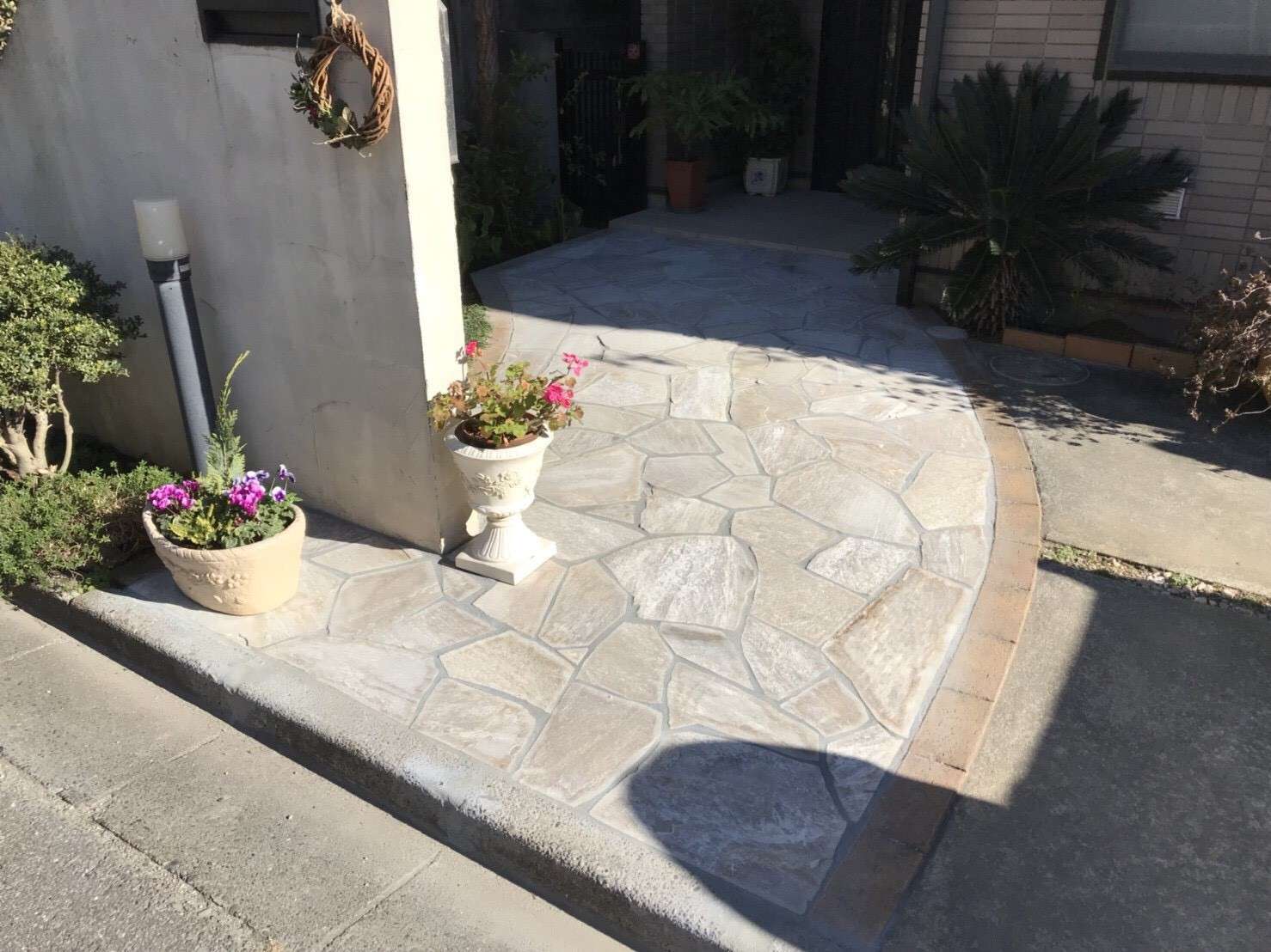 またアプローチとお庭に乱形石貼を施工致しました。