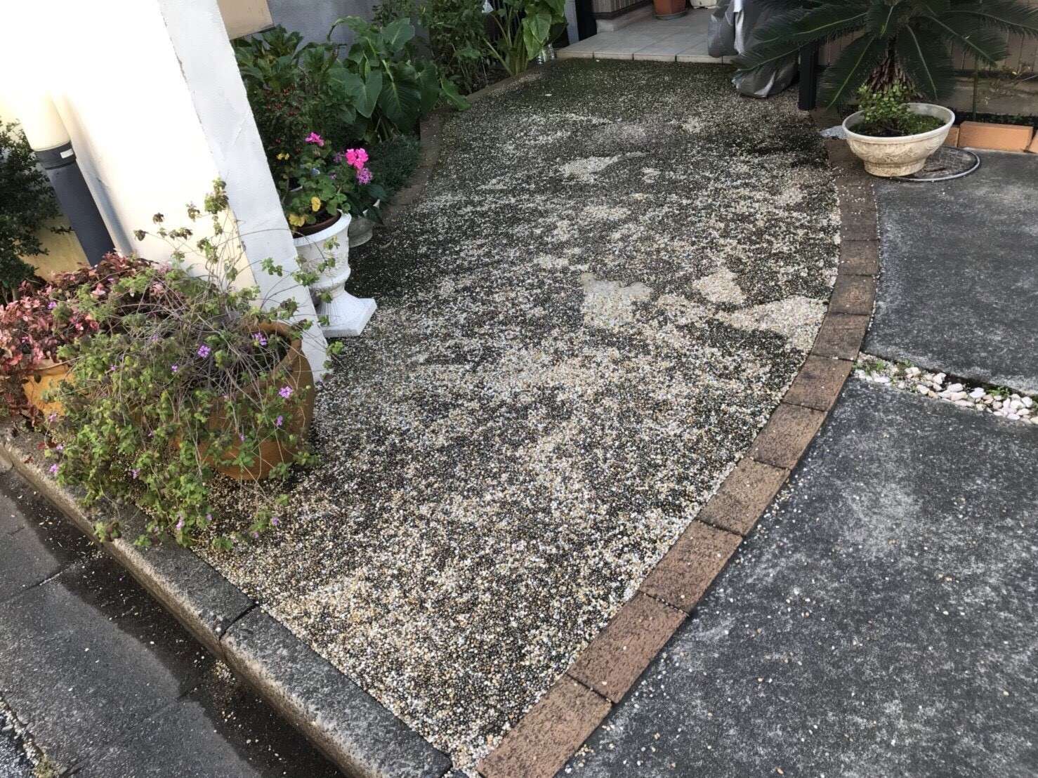 玄関前のアプローチは樹脂舗装を施工してありましたが、経年劣化などで剥がれが酷い状況でした。