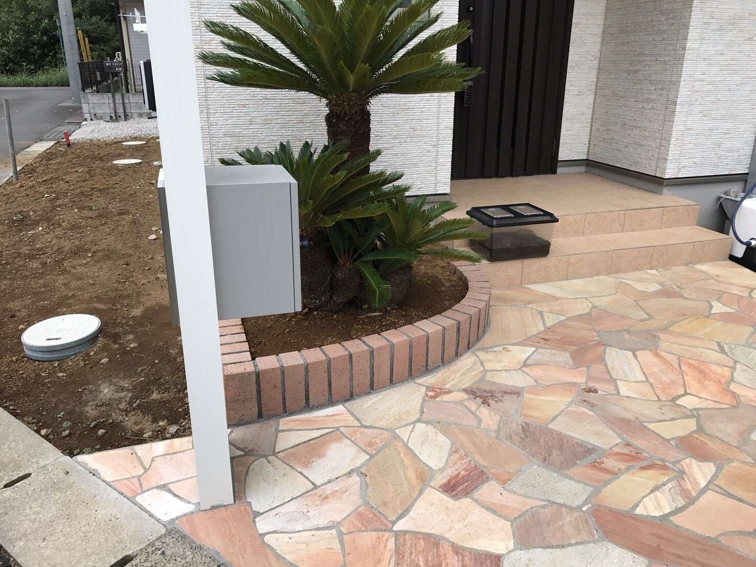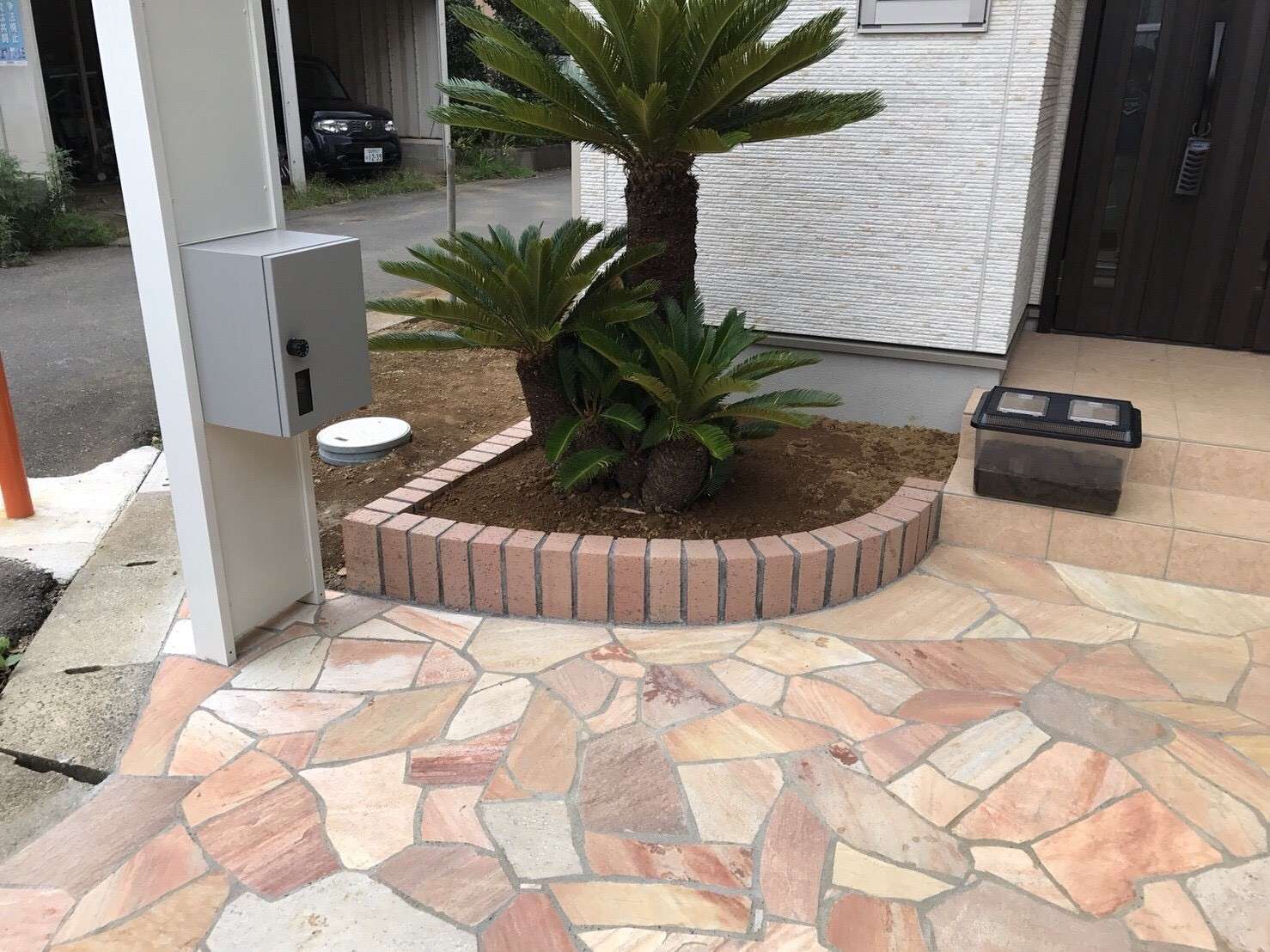乱形石貼り バイク用ガレージ カーポート タイル造作門袖 宅配ボックス 各種照明工事