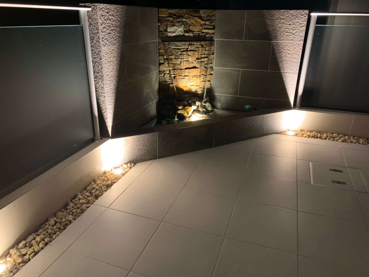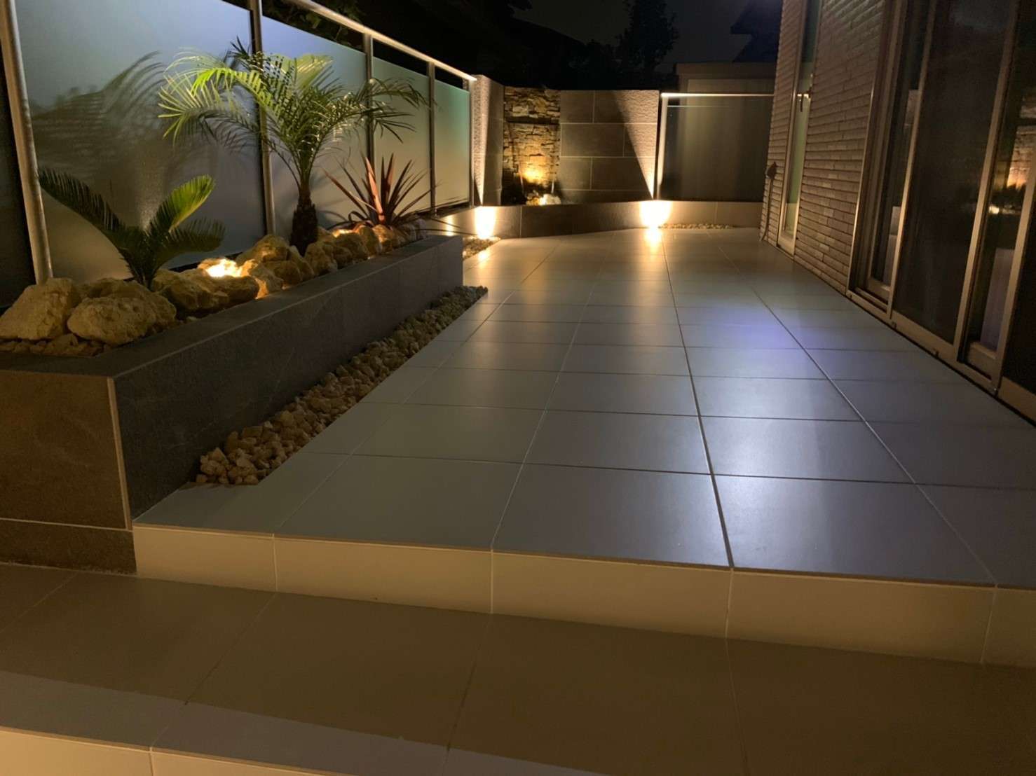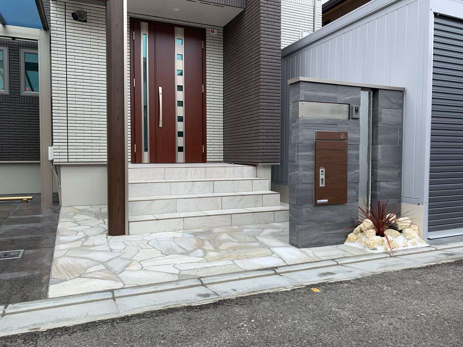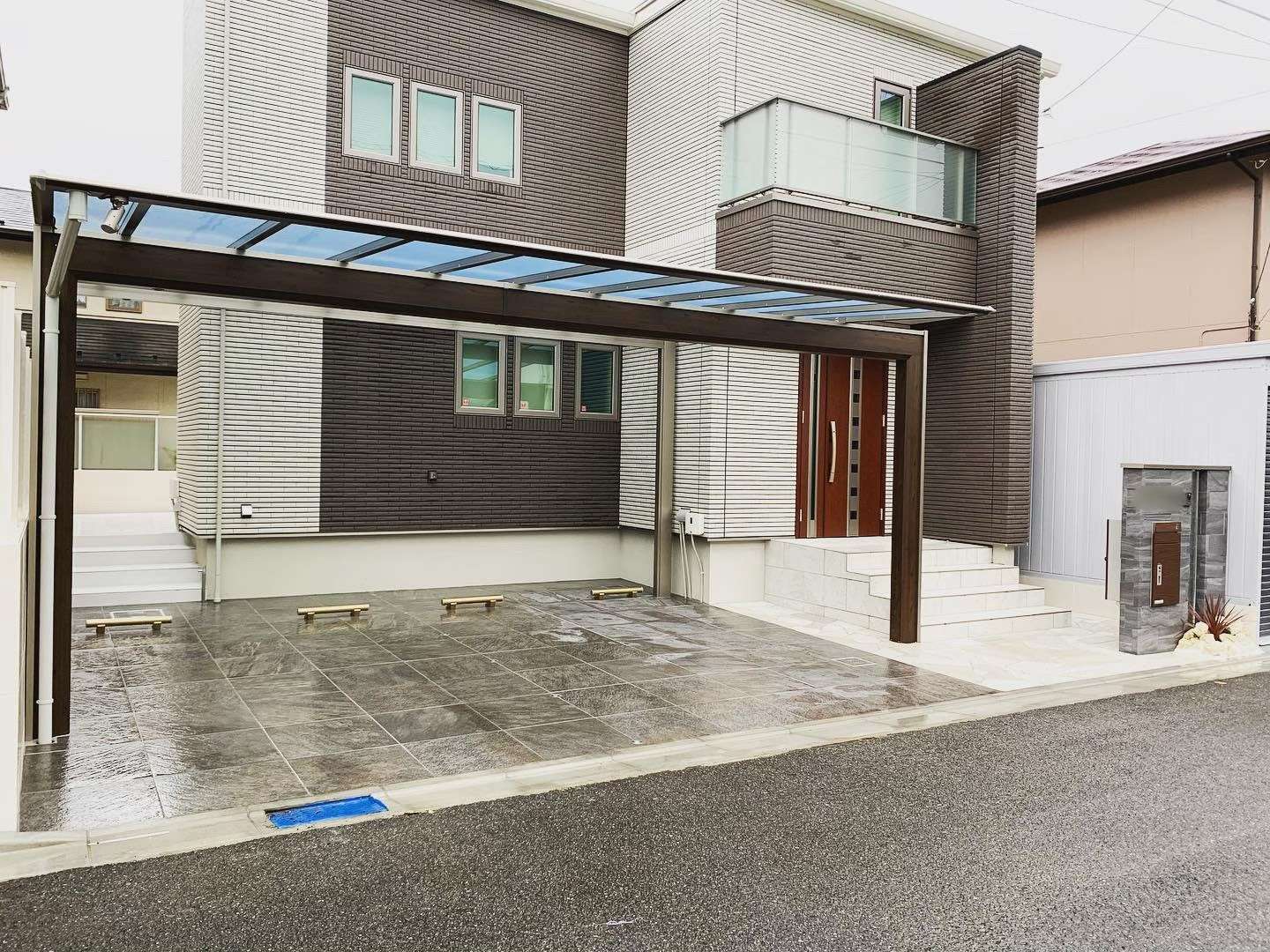 乱形石貼り バイク用ガレージ カーポート タイル造作門袖 宅配ボックス 各種照明工事
